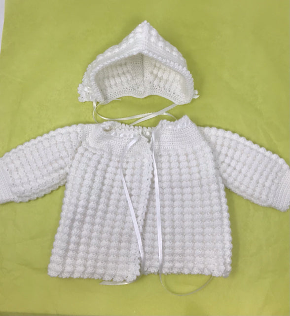 0-3 M White Arcylic Knit Cardigan and Bonnet Set