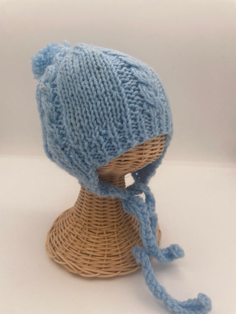 2 Y Light Blue Acrylic Knit Pom Pom Hat with Ties