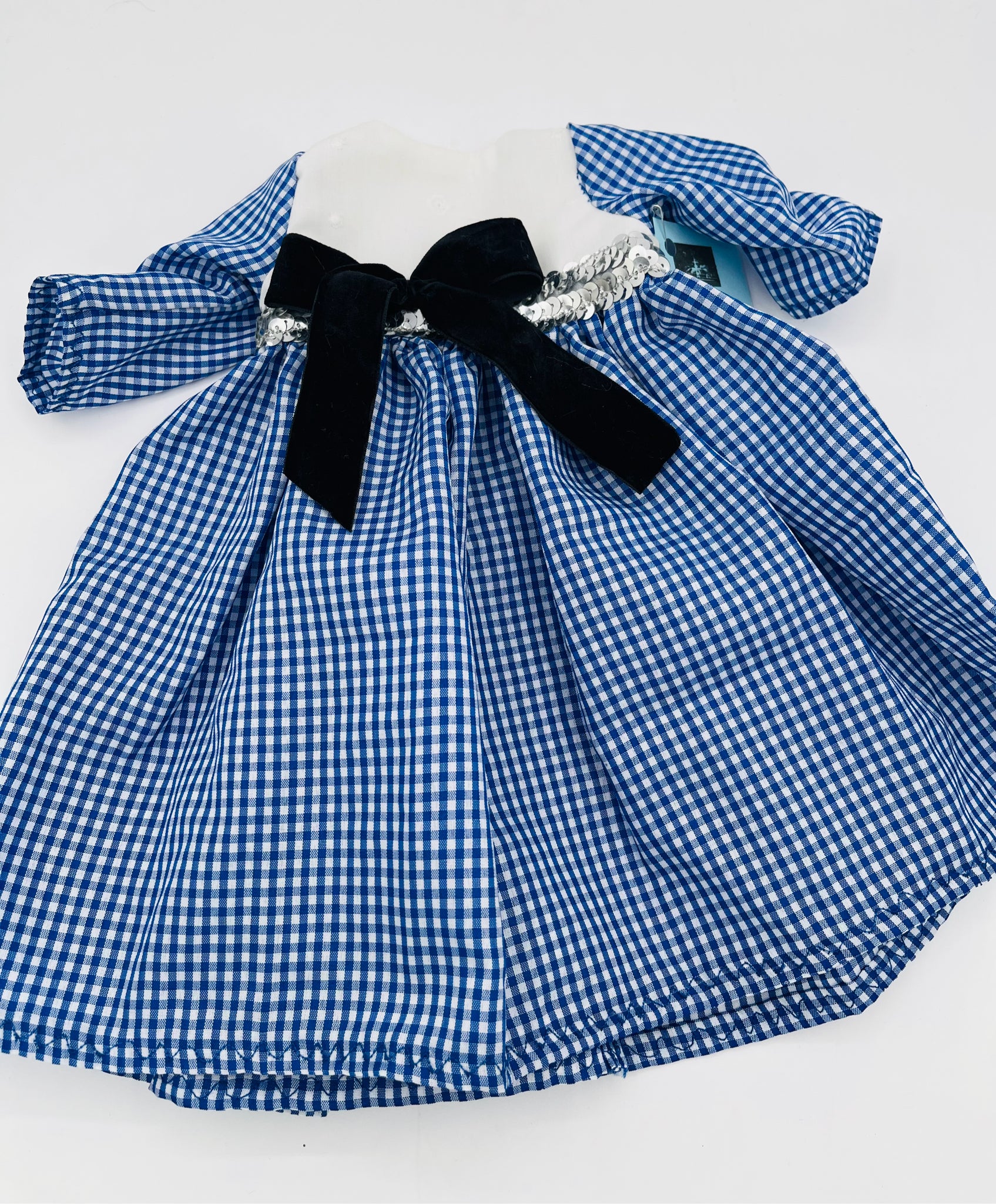 Blue Gingham Dress w/Silver Trim/Velvet Bow for 18" Doll