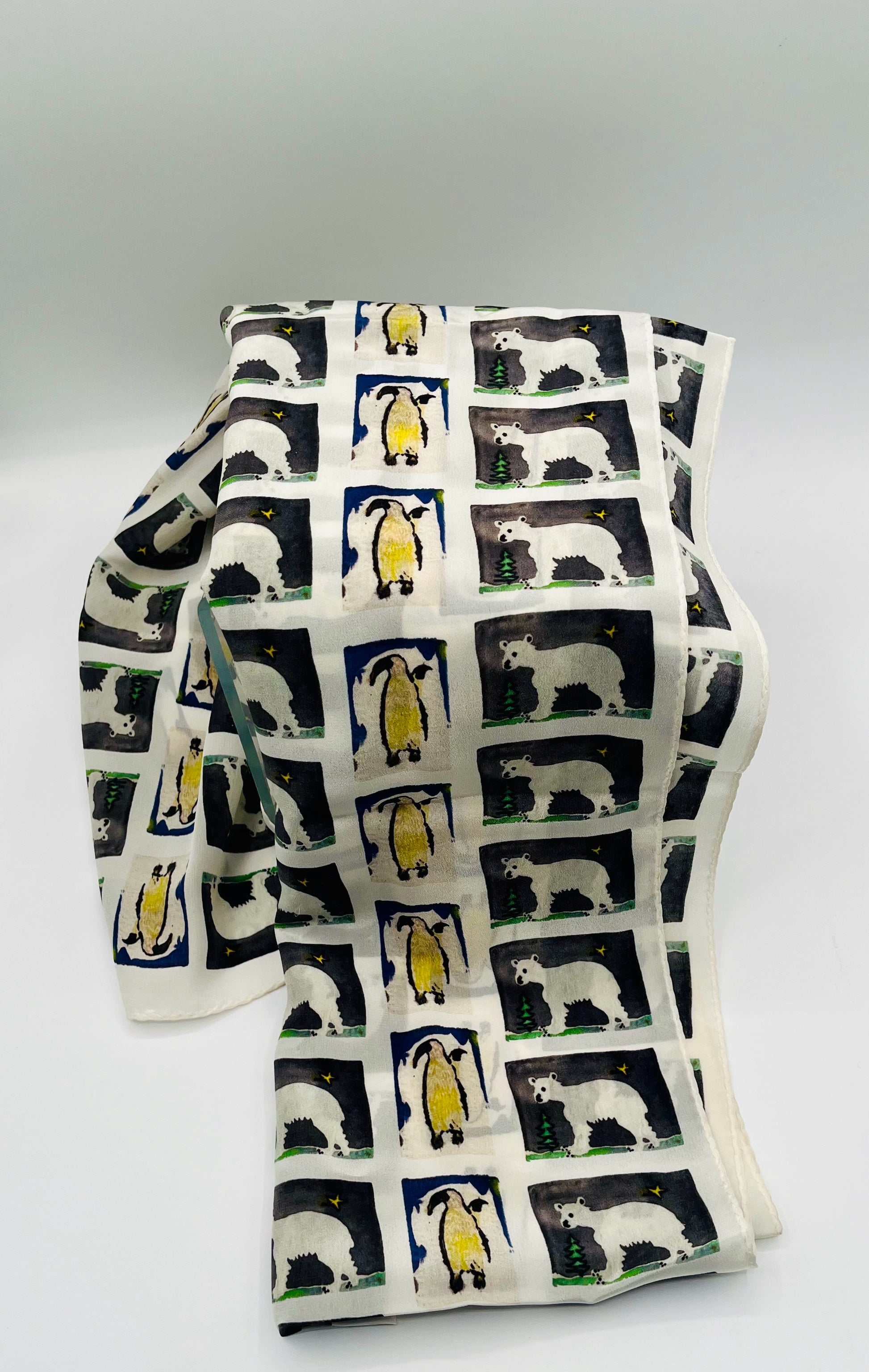 100% Silk, 68" long, 16" wide; designed in Brooklyn - printed in Italy