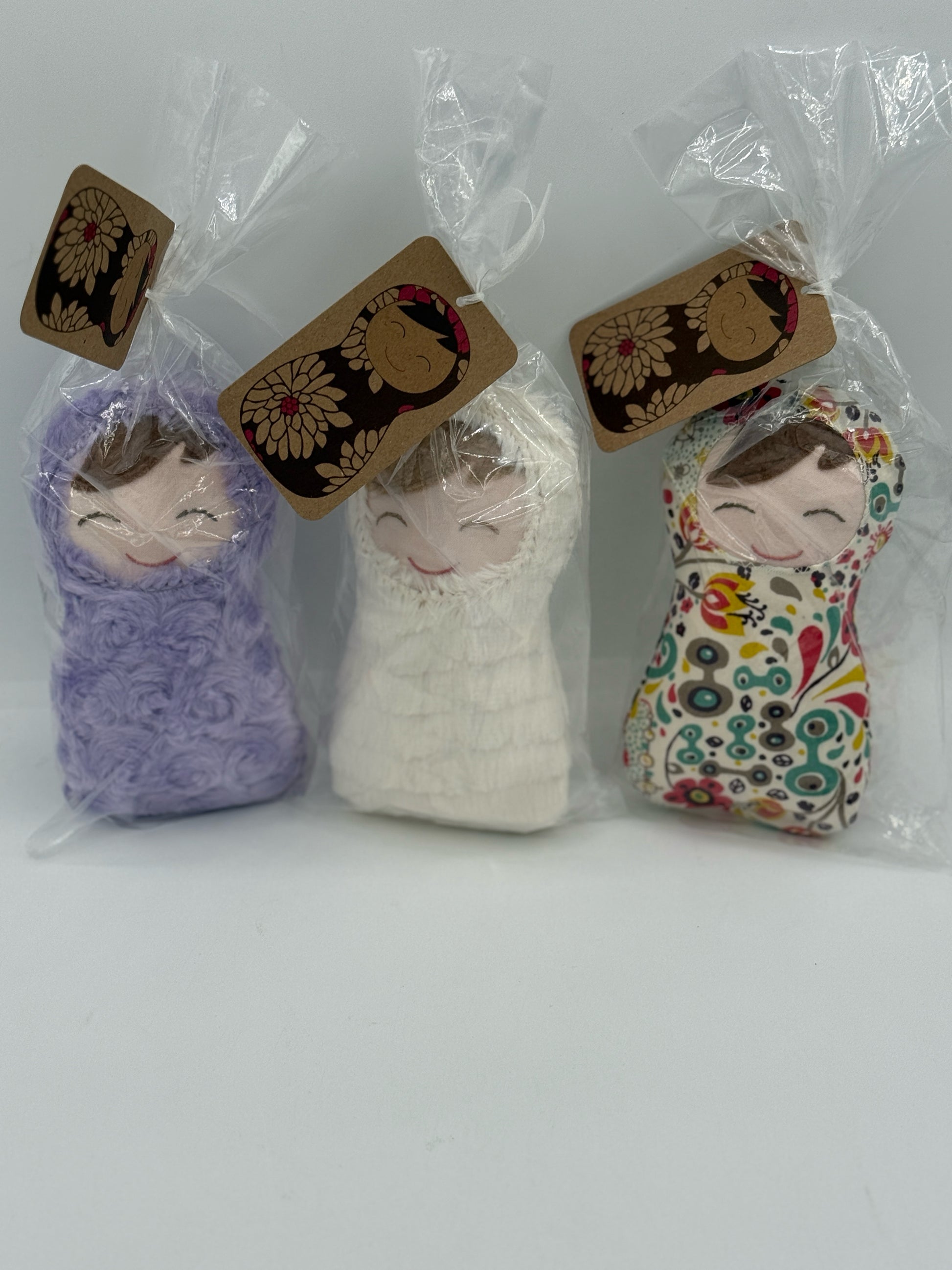 Each doll is handmade with soft fabric, specify white, purple or multi-colored