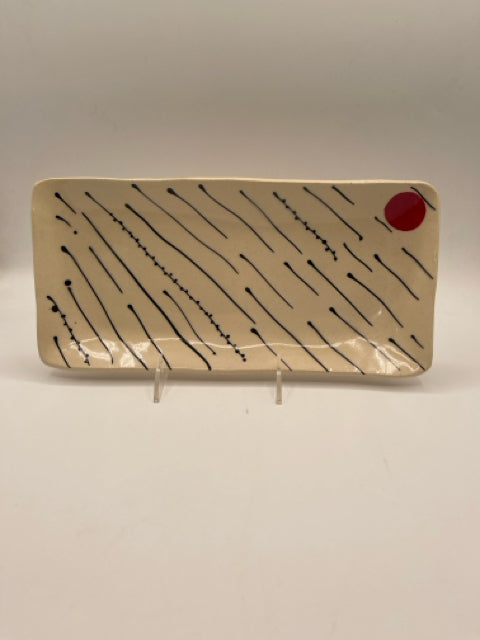 Stoneware Rectangular Platter With Black Lines & Red Dot