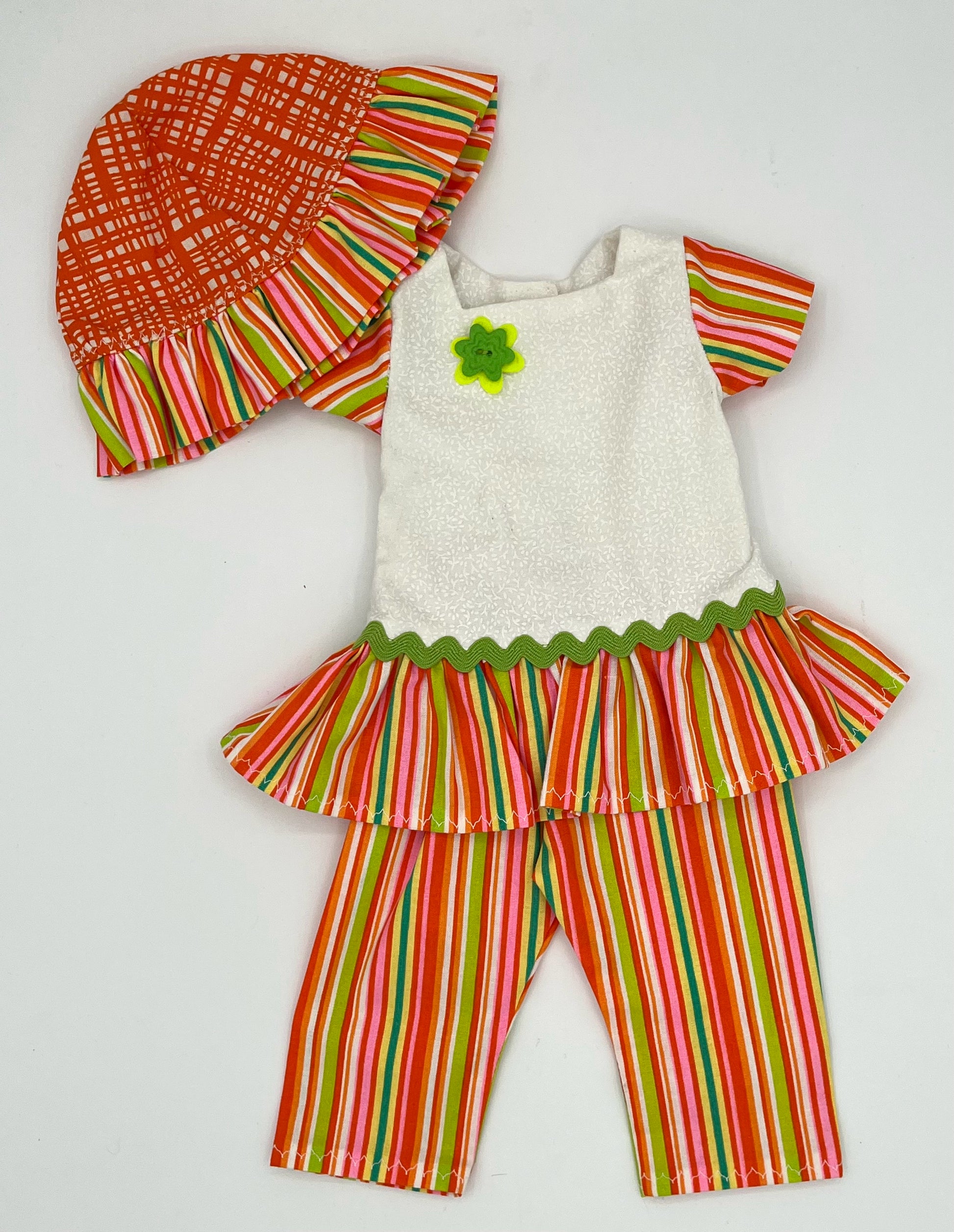 Three Piece Orange Striped Outfit with Top, Pants, and Hat for 18" Doll