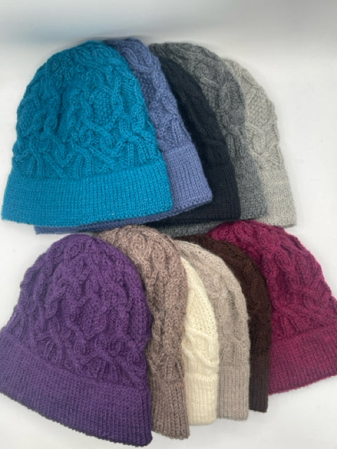 Measures 20"-22" at band. 100% Wool, Handwash and Dry Flat. Specify color choice in comments at checkout: Turquoise, Royal Blue, Black, Dk Gray, Lt Gray, Purple, Walnut, Cream, Oat, Chocolate, Raspberry